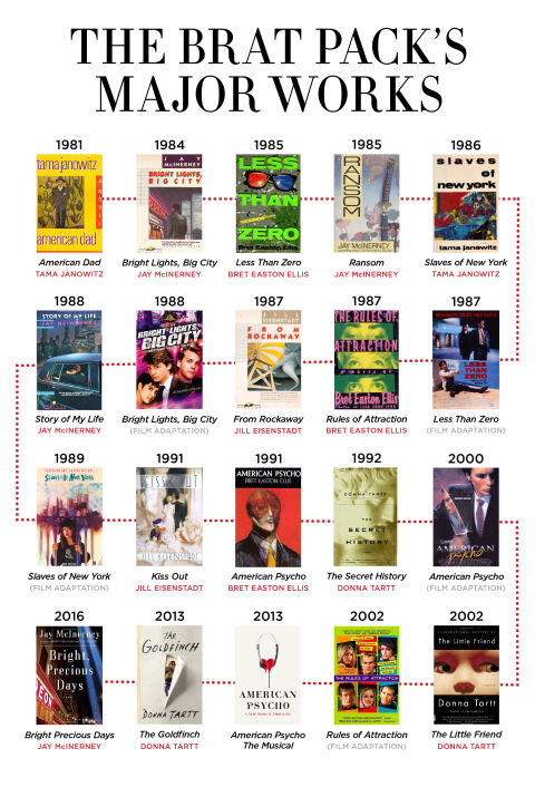 The hedonists. The provocateur. The phenom. The forgotten talent. In the decadent 1980s, the media shipped novelists Jay McInerney, Bret Easton Ellis, Tama Janowitz, Donna Tartt and Jill Eisenstadt into a loose-knit group known as the “literary brat pack.” One member would go on to win a Pulitzer; one would become better known for controversy than fiction; another would exemplify the excessive highs and very public lows of the decade; and another would slowly fade from view.