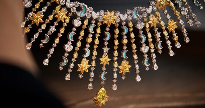 Victoire de Castellane blooms up the Belle Dior collection to life with ripples of femininity, beds of florals, celestial beings and the magic of couture. Drawing on Christian Dior’s heritage of floral landscapes, Victoire de Castellane conjured a new haute joaillerie