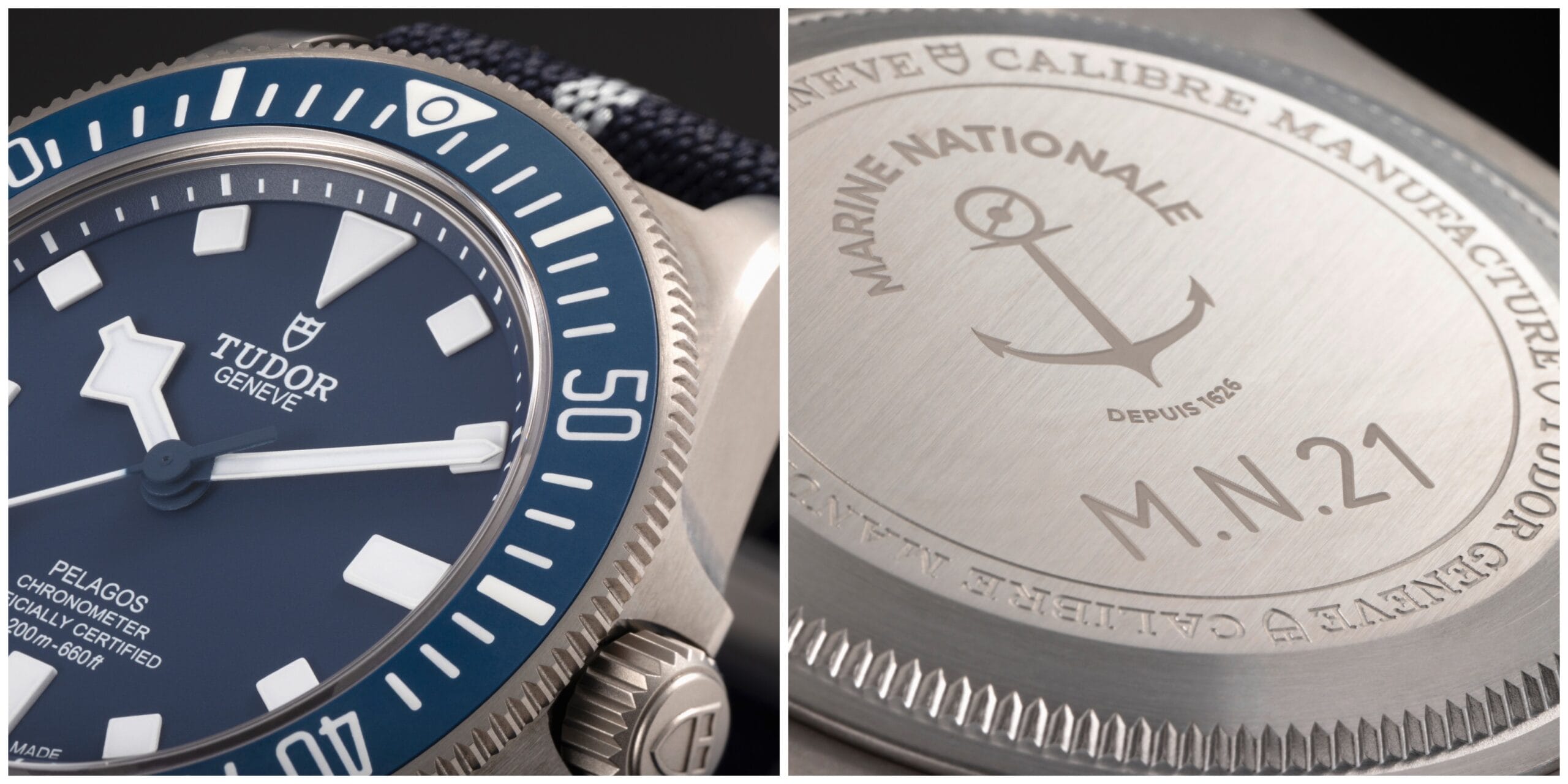 A case back engraved with the Marine nationale (French Navy) logo and the inscription “M.N.21” (Marine nationale 2021), inspired by the original engravings of the 1970s and ’80s.