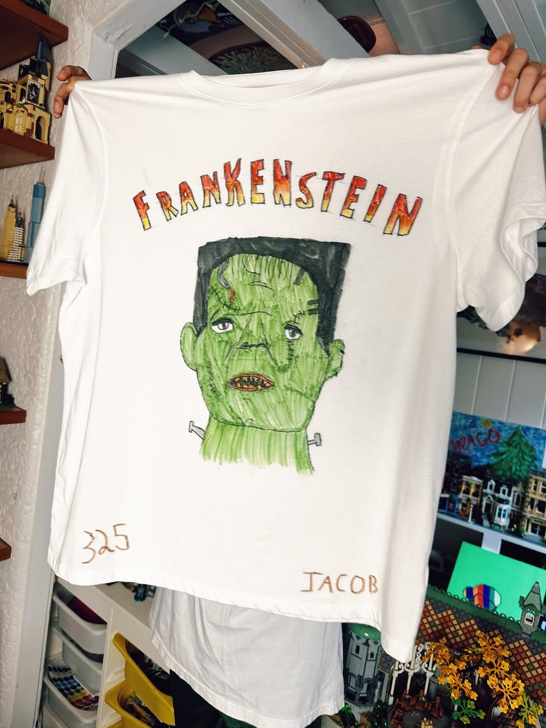 There’s no better way to rep the character you play than wearing it on your shirt. Jacob Elordi wears classic imagery of Frankenstein’s creature throughout this press tour, including an adorable hand-drawn T-shirt by a 12-year-old designer who creates custom pieces under Dylan’s T-Shirt Club.