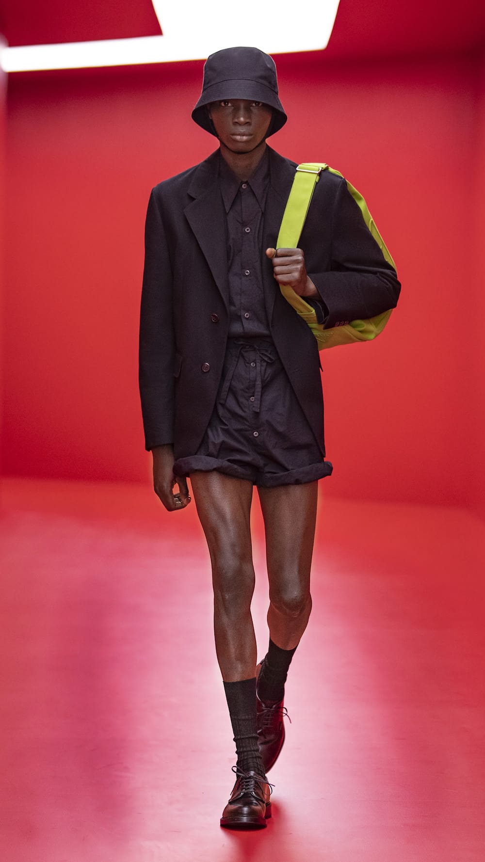 Mirroring the voice of the cryptic press release, models walked along a red meandering tunnelled runway, guided only by a strip of white light from above that served as a chaperone into the open breeze of tantalising sand, sea and dreamy blue skies of Sardinia, Italy. The collection was current and youthful, comprising of rompers, colourful vest tops, floral hoodies, and casual summer lace-up sweaters that were predominantly styled with rolled up leg-baring shorts or mod-printed skorts (yes, you read right). Teamed with utilitarian bucket hats—these were accented with functional triangular logo pockets and slits that allowed sunglasses to sit comfortably in full view—and finished with derby shoes (complete with socks), one can’t help but conjure images of children at the beach. An image cemented even further by the pairing of monochrome mackintoshes with bucket hats of the same hue.