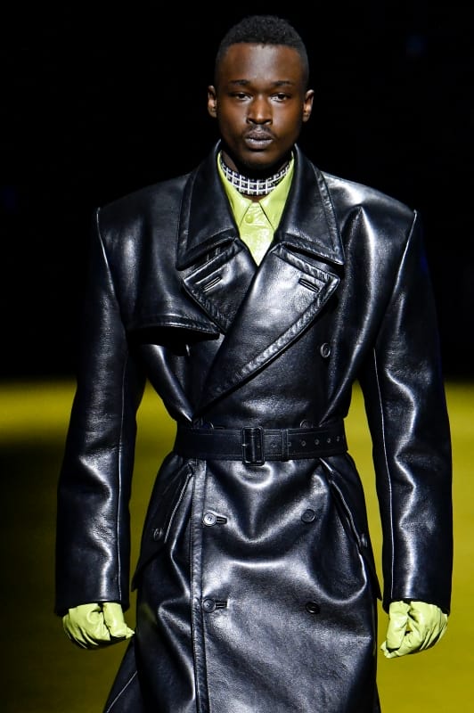 Pieces were restraint, but not minimalistic, looks were buttoned up but not overly serious. You see the modernity and futuristic appeal of Raf Simons’ vision blend seamlessly with Miuccia Prada’s reverence for exquisite tailoring and luxurious fabrics. Deep blue oversized trench coats, nipped in the waist are quickly followed up by patent leather jumpsuits in mustard and lime green. There was a beautiful juxtaposition of baggy, loose-fitting trousers with immaculately sharp shoulders and clean silhouettes. Loose fabric lay gathered at the upper of almost every model’s leather loafers, marking the end of an era where men would painstakingly measure the hem of their trouser leg to fit just right.