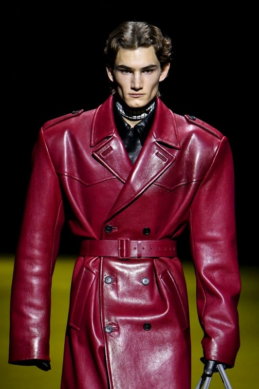 Pieces were restraint, but not minimalistic, looks were buttoned up but not overly serious. You see the modernity and futuristic appeal of Raf Simons’ vision blend seamlessly with Miuccia Prada’s reverence for exquisite tailoring and luxurious fabrics. Deep blue oversized trench coats, nipped in the waist are quickly followed up by patent leather jumpsuits in mustard and lime green. There was a beautiful juxtaposition of baggy, loose-fitting trousers with immaculately sharp shoulders and clean silhouettes. Loose fabric lay gathered at the upper of almost every model’s leather loafers, marking the end of an era where men would painstakingly measure the hem of their trouser leg to fit just right.