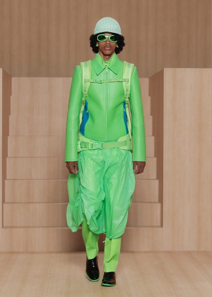 A ‘rave’ concept is also explored due to the cross-cultural impact it has had on many of the subcultures that fashion is inspired by today. The dress code of the music and dance culture is seen in elevated neon tracksuits, tie-dye on leather tailoring, denim and skirts, as well as accessories.