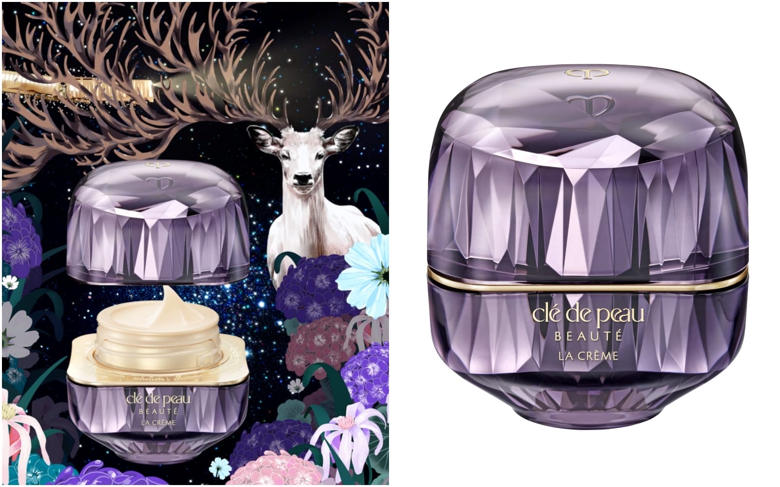 Lastly, for evening, La Crème offers intensive nighttime restoration. The formula targets skin’s innate regenerative potential, delivering renewed resilience and youthful density by morning. Its packaging features the majestic white stag, radiating an aura of strength and grace. Our heroine climb onto the great beast’s back, as takes her to a future briming with promise.