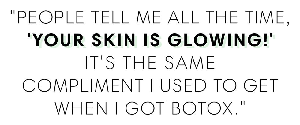 Hayat received regular Botox treatments twice a year for five years—and was cautiously optimistic before starting gua sha. While her fine lines haven’t disappeared completely, the deeper lines are less noticeable. “Right over the eyebrow, where you get a little line, a crease, those have softened,” she explains. “People tell me all the time, ‘You’re glowing, your skin is glowing! You’re so bright!’ It’s the same compliment I used to get when I got Botox.”