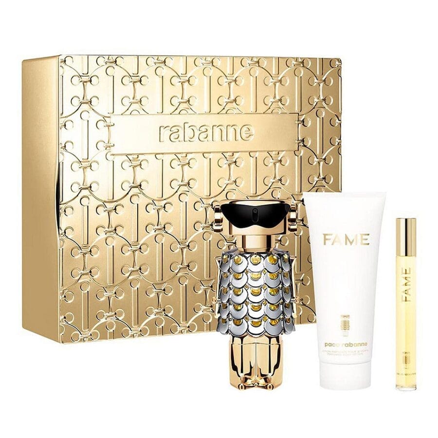 Rabanne’s Fame set captures joy and sensuality in a dazzling limited edition gift set. The kit includes the playful Fame Eau de Parfum, a matching body lotion for silky skin, and a convenient travel spray. With notes of jasmine, mango, and creamy incense, this trio is perfect for those who adore bold, unforgettable fragrances.