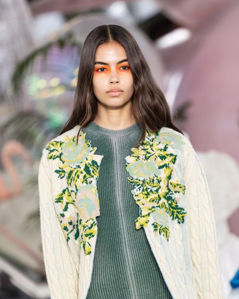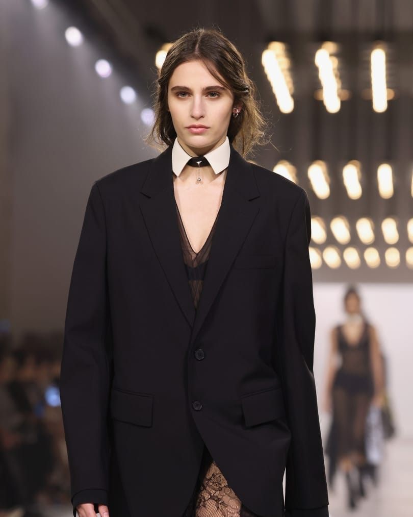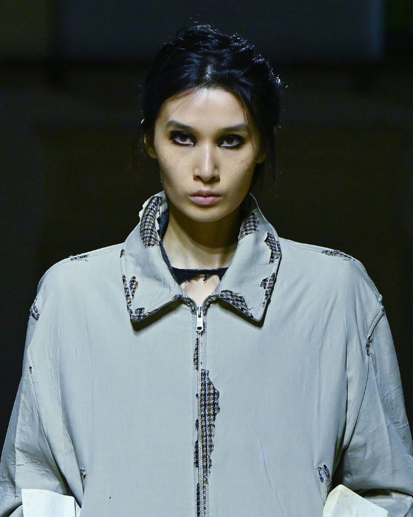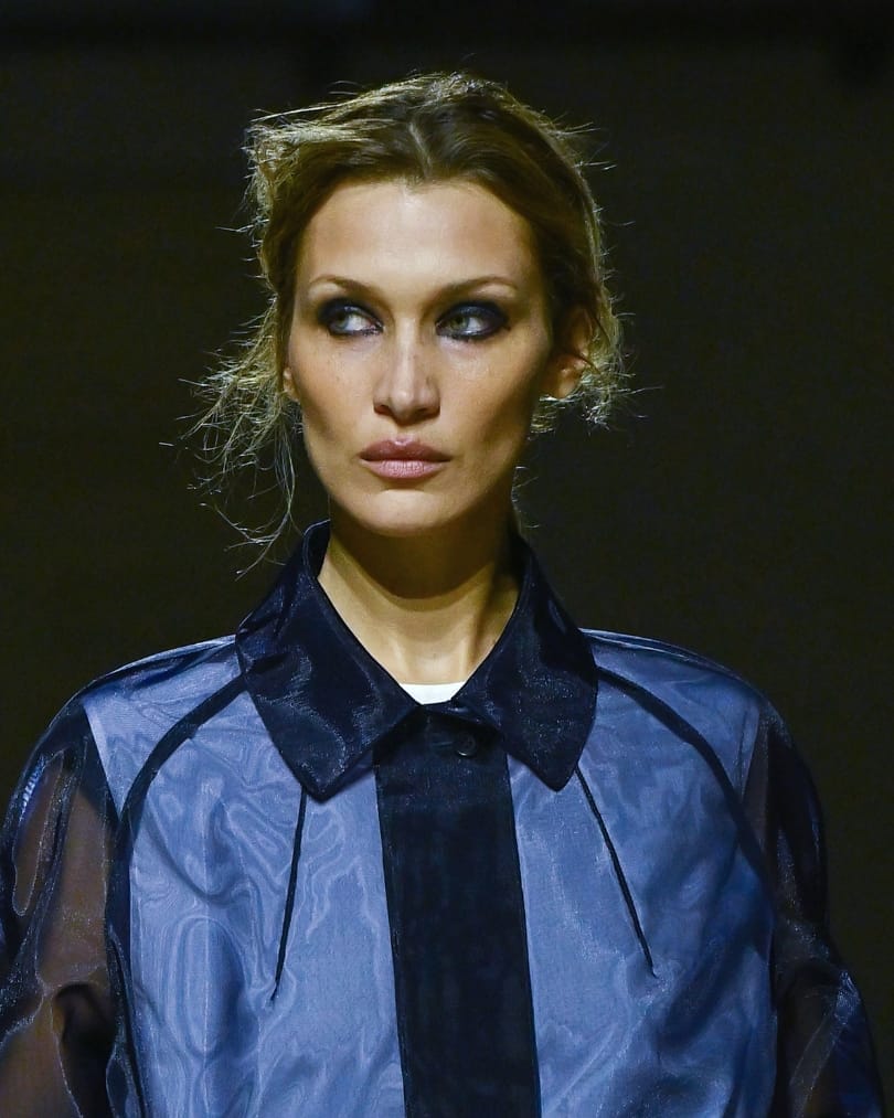 At Prada, the so-called “tired girl” aesthetic took on new resonance. Smudged charcoal liner encircled the eyes, deliberately imperfect and slightly lived-in, while skin remained natural and unfiltered. Hair was loosely pulled back into undone ponytails, reinforcing a sense of controlled chaos. The look blurred the line between exhaustion and intention, reflecting a woman navigating constant change. There was vulnerability here, but also strength. In embracing dark circles and messy textures, Prada reframed imperfection as something modern and quietly powerful.