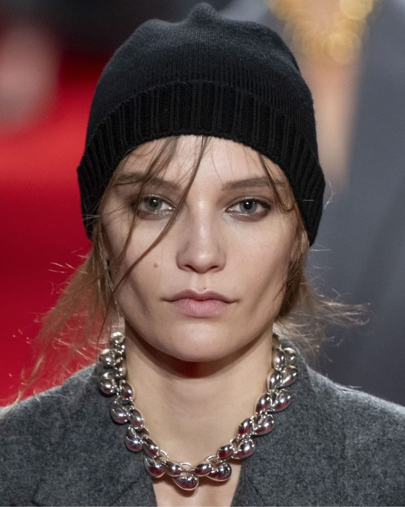 Texture extended beyond the garments at Bottega Veneta and into the beauty direction. Many models wore tactile hats that concealed most of the hair, while any visible strands appeared softly rumpled. Across the lids, cool grey shadows were blended close to the lashline and topped with a faint sheen. A pinpoint of silver at the inner corners sharpened the gaze without overwhelming it.