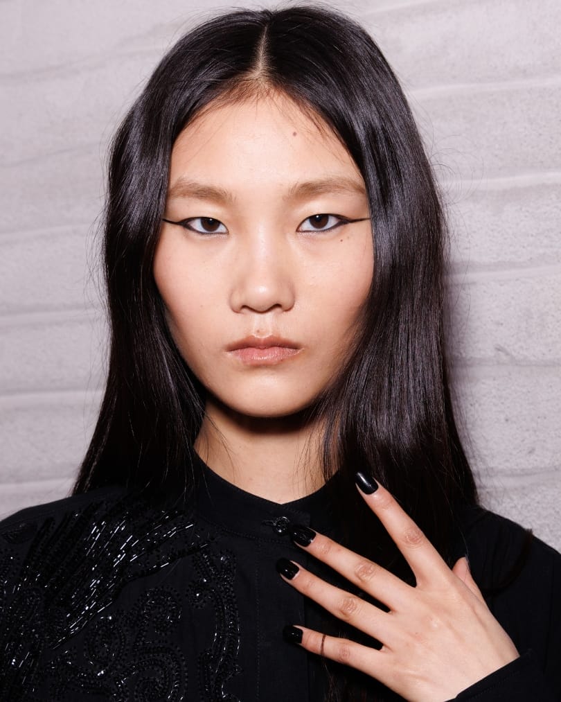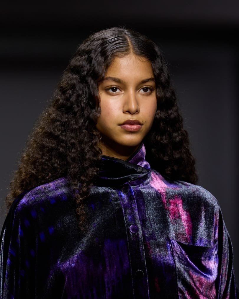 Childhood memories of Adrian Appiolaza’s Argentina filtered through the runway at Moschino, from gaucho motifs to playful pixelated graphics. Against that exuberant backdrop, hair remained largely unstyled—loose or gathered into low buns with stray tendrils. The statement arrived via the lower lashline, where liner extended into elongated wings in black, cobalt and emerald. It was a small but striking gesture, injecting personality without competing with the collection’s theatrical references.