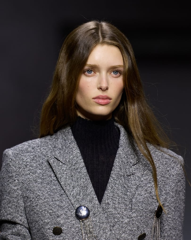 For her return to Fendi after 27 years, Maria Grazia Chiuri set a tone of unity with her “Less I, More Us” message, and the beauty echoed that sentiment. Guido Palau’s low ponytails, softened by flyaways, nodded subtly to the house’s heritage while keeping things unfussy and modern. Make-up focused on refined individuality: luminous, cinematic skin paired with tailored liner and lip shades that shifted from muted nudes to warmer terracottas.