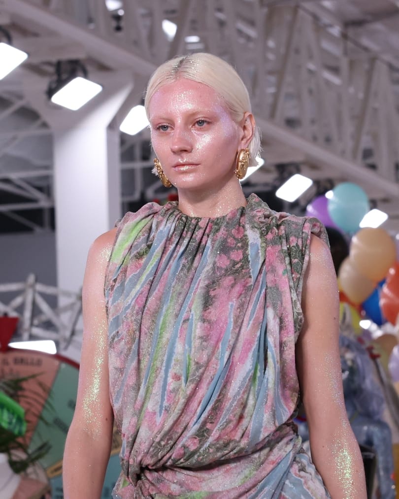 By the time models stormed the runway at Diesel, it looked as though the party had already happened. Neon pigments in pink, lime and orange were smeared across lids, while pastel glitter clung to skin in irregular swathes. Clashing prints and chaotic silhouettes amplified that 5am atmosphere, as if glamour had been left to unravel overnight. For anyone wanting a gentler translation, a product such as Ultra Violette’s Queen Screen SPF50 Super Glow Drops delivers a controlled sheen—offering luminosity and protection without the full glitter fallout.