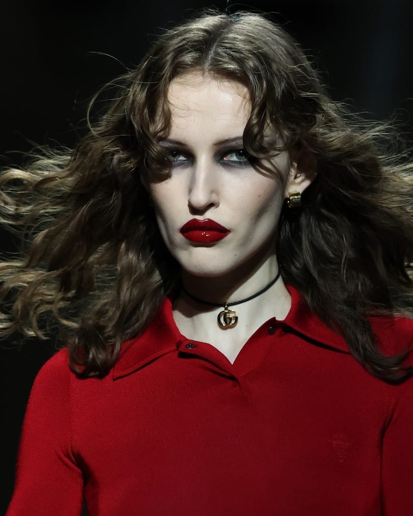 A museum-like set framed Demna’s first outing at Gucci, complete with echoes of the Tom Ford years. That legacy of overt sensuality surfaced immediately in the faces: dense black liner pushed high into smoky wings, cheekbones carved with intention, lips glazed in frosted neutrals. Brows were deliberately lightened, exaggerating the late ’90s and early noughties references threaded through the collection. Slick hair on some models gave way to buoyant, supermodel waves on others. The result felt hedonistic and self-aware, reviving Gucci’s sex appeal without softening it.