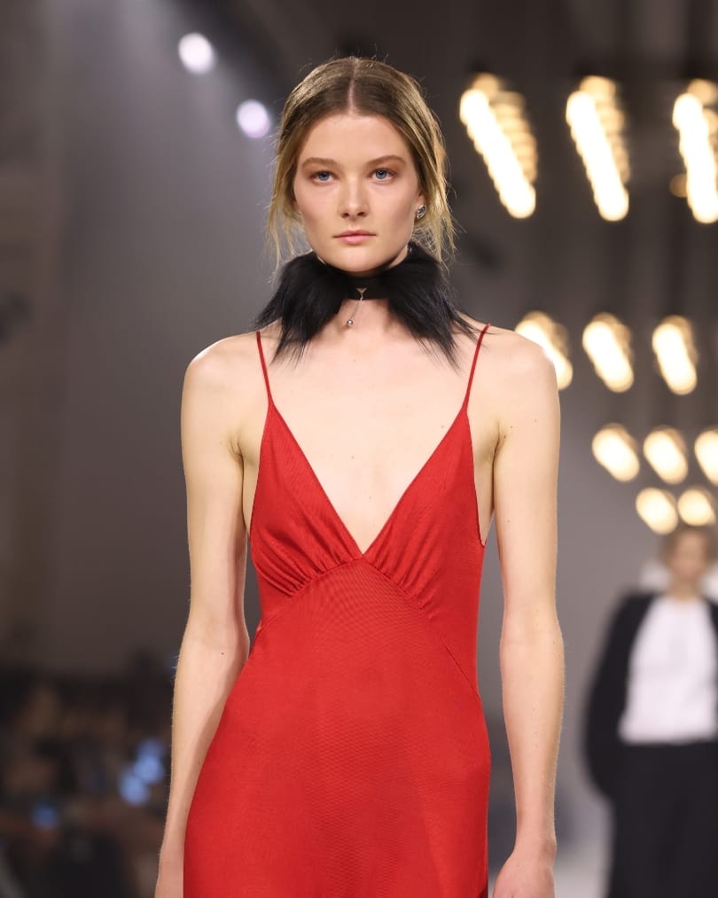 Backstage at Emporio Armani, beauty worked in harmony with the collection’s cool greys, blues and muted reds. Skin appeared lit from within, softly radiant rather than overtly glossy. Matt shadows subtly defined the eyes, finished with sculpted lashes that added quiet structure. Lips carried a restrained flush of red, enough to punctuate without overpowering. The overall mood was fresh and effortless, reinforcing the house’s balance of masculine tailoring and fluid femininity.