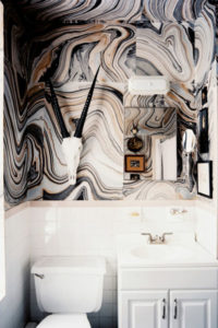 Spice up any bathroom with walls in unexpected prints, or hanging details showcasing your aesthetic; Image courtesy of Lonny By Anne Lee on June 27, 2016 in