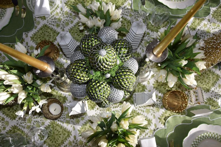 A few weeks before Christmas I start to think about a colour scheme and style for my table. One rainy Sunday in early December, with the help of a glue gun, I created the green and silver bauble moss centrepiece. I will be drawn to something specific early on in the planning process – this year it was the green and diamond bauble (I must admit to rarely steering too far away from my default setting of blue and green).