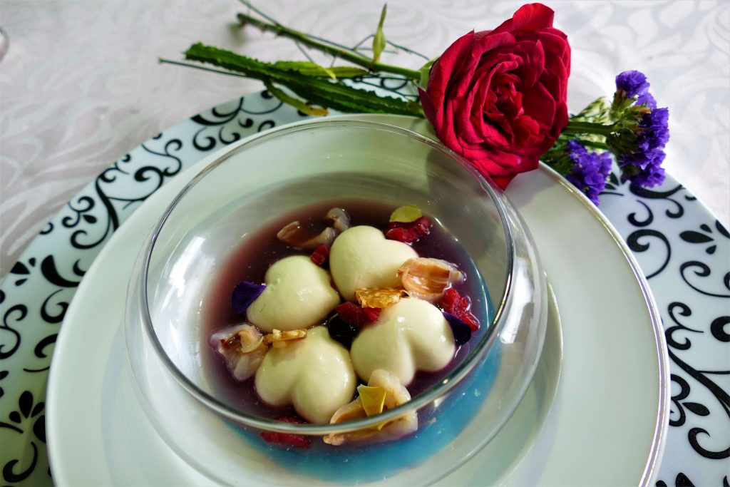 Boba pearls, lychee, raspberry, rose consommé
