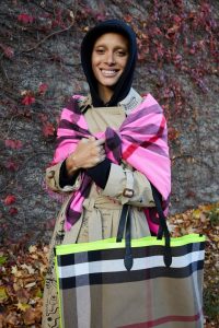 adwoa-aboah-for-burberry-captured-by-juergen-teller-wearing-a-doodle-print-trench-coat-the-bandana-in-block-neon-check-and-the-giant-tote-with-acid-yellow-taping-1513612234 By Melanie Chow on December 19, 2017 in