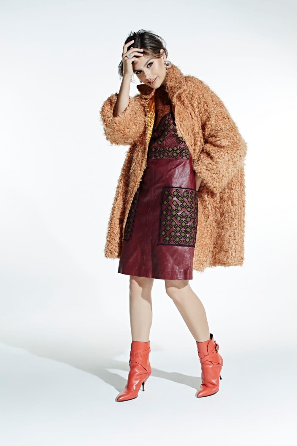 Coat; dress; and coat, all from Bottega Veneta. Earrings, and ring from Chopard.