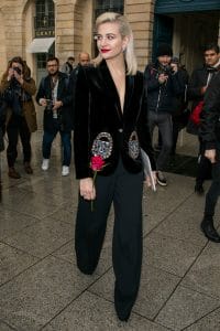 Prev12 of 15Next Getty 22 January Pixie Lott arrived at the Schiaparelli show wearing a black Schiaparelli velvet blazer and wide-leg trousers, with a red lip and a rose to match. Prev12 of 15Next