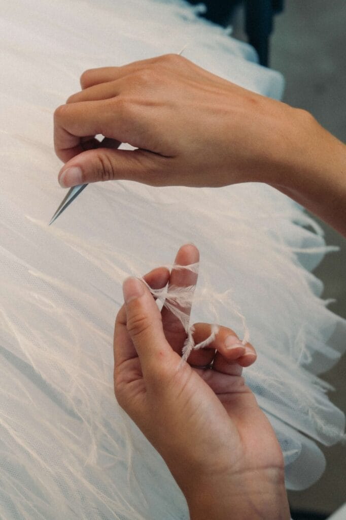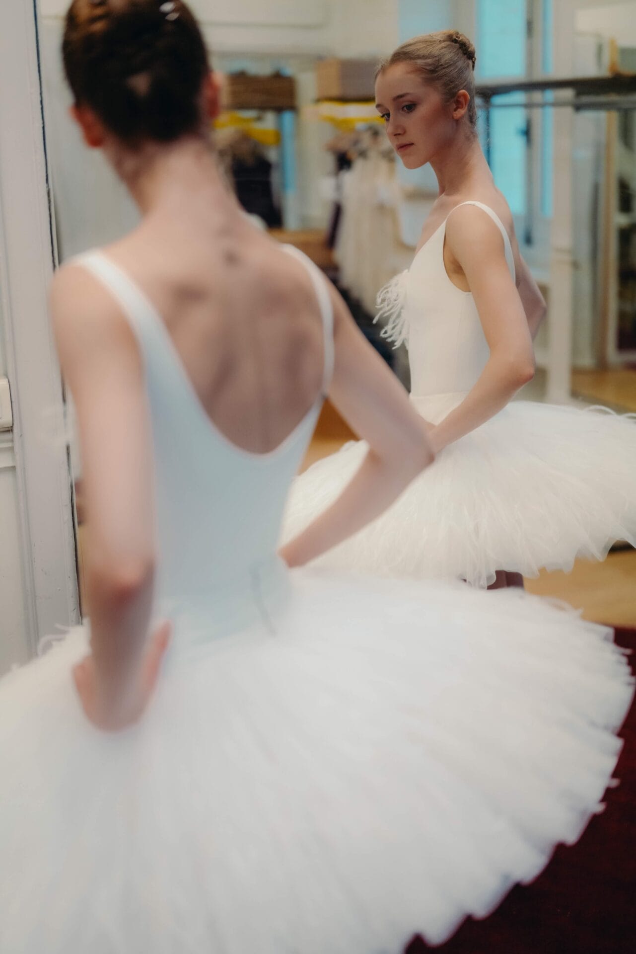 The artistry is breathtaking in its detail: twelve tutus, each one hand-embellished with 300 meticulously placed pinches of ostrich feathers that catch and diffuse light with every movement. The corsets, too, bloom with featherwork, each finished with a hand-embossed white satin camellia—that eternal signature of Chanel—creating garments that exist somewhere between couture and poetry.