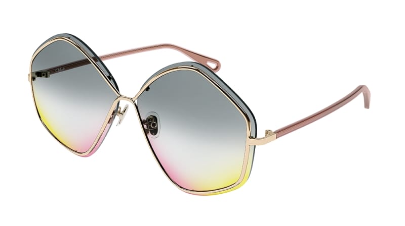 Lahya carries an iconic pentagon silhouette rendered through 2D bubble lenses dipped in varying shades that result in a polychrome effect. Lahya’s lightly structured frame is comprised of a thin metal piping that sits on the lenses, supported by long and coloured silicon temples that feature Chloé’s signature teardrop cut-out at its tips. The cut-out is both fashionably chic and functional, allowing you to attach Chloé’s jewellery chain through it so you can hang your sunglasses around your neck. Lahya presents an upbeat twist that nods to the joyful tints of a rainbow.