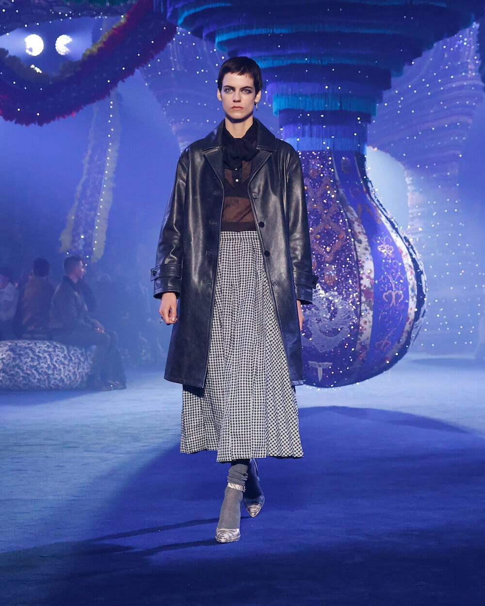 House staples such as the Bar jacket, trench coats, crisp shirts and pleated skirts were ever-present throughout the predominantly black collection. These were punctuated with bursts of jewel-toned hues that transpired as dégradé knits, graphic checks, and feminine floral blooms—another nod to Catherine Dior. To note, archival 1950s warp-print florals were omnipresent, scattered vividly across dresses and skirts that evoked the silhouette and allure of the ’50s. Elsewhere, other quintessential Dior prints including the emblematic Houndstooth and the iconic Mizza print underscored the Maison’s rich heritage.