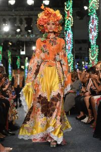 In celebration of the opening of Dolce & Gabbana's Dubai mall boutique, the luxury fashion brand hosted a catwalk show. The collection included elegant evening dresses and floral headpieces, as well as tailored tuxedos. The runway was designed to transport viewers to an Italian city with green, white and red lights and golden details to mimic the warm daytime sun.