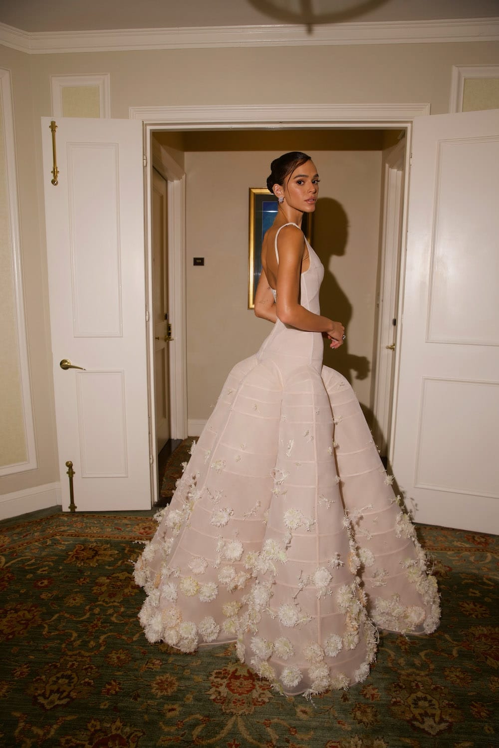 For Burch, conceptualizing Marquezine’s look meant looking to the past for inspiration, but applying a modern twist. The designer’s team presented the actor with over 20 different versions of the gown before they settled on the version that graced the steps of the Met. “Bruna and I focused on bringing a sense of modernity to historical techniques,” Burch tells Bazaar, noting that they started with the corset and hoop skirt, and that the pebbled organza served to highlight the piece’s intricate construction and boning. “We imagined flowers from the past [as inspiration for the look]—preserved, beautifully aged, and not too precious.”