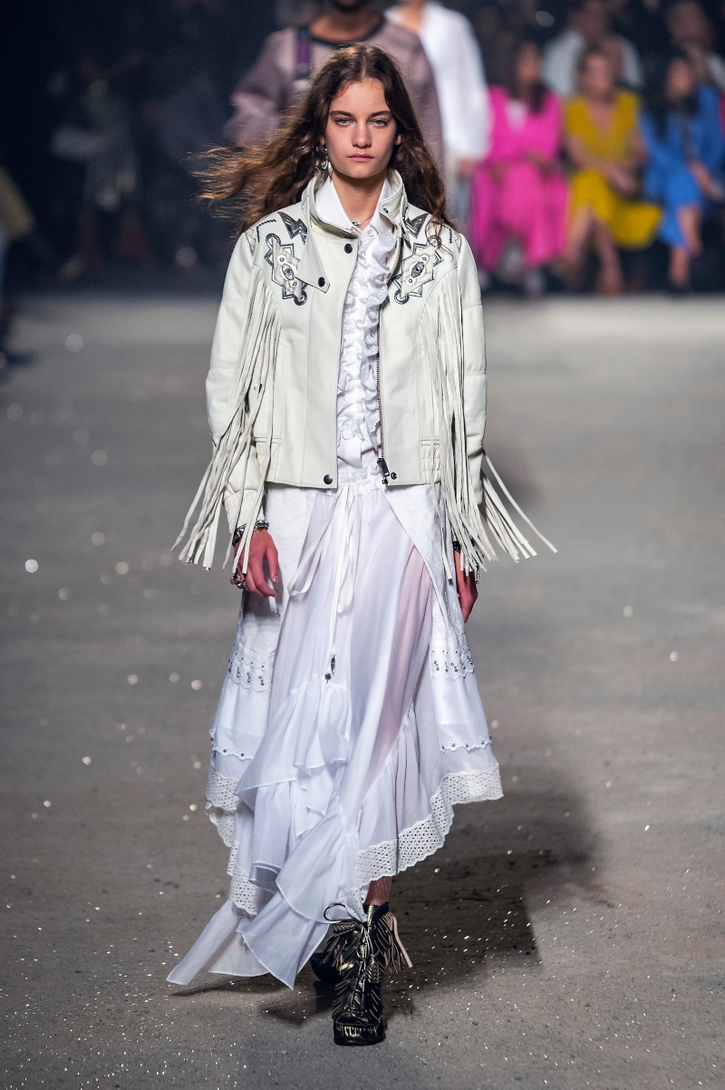 According to Vevers, the collection was all about “salvaging and scavenging”; he wanted to stay true to his vision to construct a contemporary outlook of Americana through the eyes of the New Romantic. The outcome? A past-and-future collide, expressed through a post-apocalyptic-meets-Midwest collection. To begin, Vevers sent down an androgynous model in a creamy dress that featured a Victorian ruffled neckline, and teamed it with an oversized patchwork leather vest and desert boots that was part-Mad Max, part-The Road. Beyond vintage prairie dresses, floaty smock skirts, and balloon-sleeved blouses in desert hues, Vevers also showcased the versatility of denim and leather, evident through patchwork on dresses, jumpsuits, and jackets. The clothes were further accentuated by an eerie dystopian set, complete with an enormous brontosaurus structure called Bronty, which was constructed from oxidised metals and placed in the middle of the gravel-and-sand strewn runway.