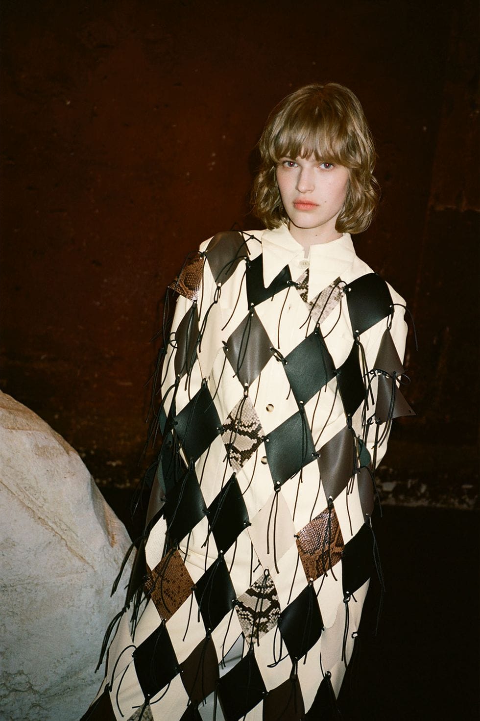 Duality, optical illusion, and trompe-l’oeil are three things that could make for quite a trippy collection, yet Nanushka’s Sandra Sandor avoids sensory overload by thoughtfully surprising and adjusting rather than dramatically scrambling. Classic pieces are reworked in intimate ways that might not be obvious at first glance (lapels skinnier; dress shirts cut like elongated tunics), but surprise you when you peer closer. Masks, those omnipresent accessories of 2020, also inspired some of the more unusual cuts, like a leather-duster-cum-vest and patchworked net dress. “Wearing masks has made life feel quite anonymous,” Sandor said in the show notes. “It led me to consider what we reveal and what we conceal in a new way.” Masks for the win again.—Leah Melby Clinton