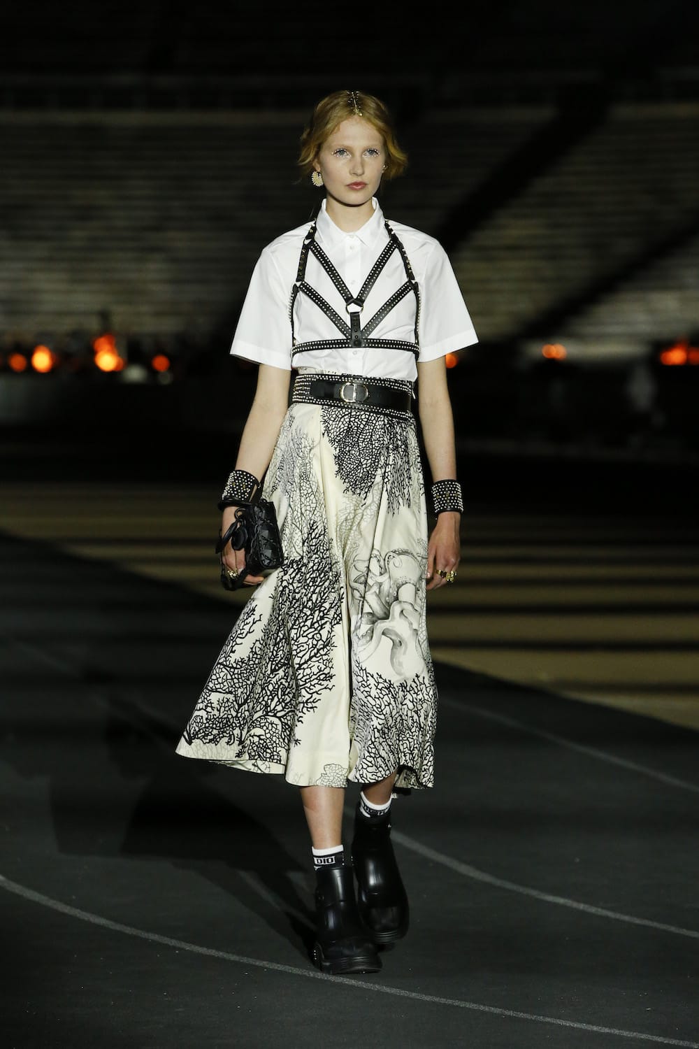 For Cruise 2022, Maria Grazia Chiuri brought us to the Panathenaic Stadium in Athens, Greece. No surprises as to what the inspiration was here. This season, fluidity and sports were a central theme at Dior, focused on the freedom of movement and ease of the human form. Echoing post-lockdown sentiments and cravings? Perhaps. Swirls of flowing white peplos dresses floated down the runway, armoured with beaming radiance that took shape as golden flashes on shoes and belts. The modern Goddesses who roamed the track in trainers and boots were confident and carefree. Now and again, athleisure broke through the calm in swatches of mesmerising print and colour—Greek blue was most prominent—followed by contemporary ready-to-wear pieces treated with sporty elements and harnesses that brought images of gladiators to the forefront. As always, feminism works her way into the folds of the collection with effortless grace. Light as her footsteps may be, she bore an empowered and confident demeanour that revelled in the delights of freedom and nonchalance—a vision of modernity and sophistication.