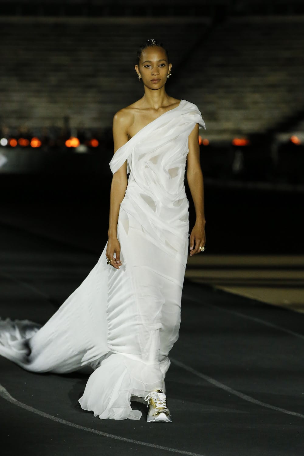 For Cruise 2022, Maria Grazia Chiuri brought us to the Panathenaic Stadium in Athens, Greece. No surprises as to what the inspiration was here. This season, fluidity and sports were a central theme at Dior, focused on the freedom of movement and ease of the human form. Echoing post-lockdown sentiments and cravings? Perhaps. Swirls of flowing white peplos dresses floated down the runway, armoured with beaming radiance that took shape as golden flashes on shoes and belts. The modern Goddesses who roamed the track in trainers and boots were confident and carefree. Now and again, athleisure broke through the calm in swatches of mesmerising print and colour—Greek blue was most prominent—followed by contemporary ready-to-wear pieces treated with sporty elements and harnesses that brought images of gladiators to the forefront. As always, feminism works her way into the folds of the collection with effortless grace. Light as her footsteps may be, she bore an empowered and confident demeanour that revelled in the delights of freedom and nonchalance—a vision of modernity and sophistication.