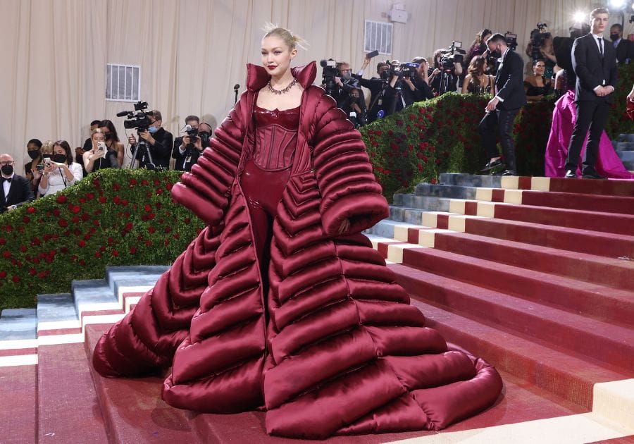 We can safely say that this supermodel understood the assignment. Unveiling her Atelier Versace puffer coat that’s made of a deep jewel-toned burgundy silk Duchesse and a matching deep red corset suit, she literally matched the red carpet completely.