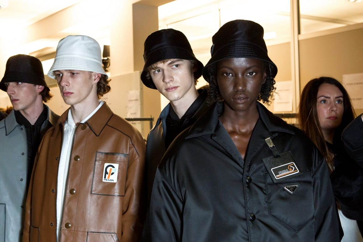 Behind the scenes at the Prada Pre Fall fashion show, which features many tributes to the brand’s signature pocone nylon. Imaxtree