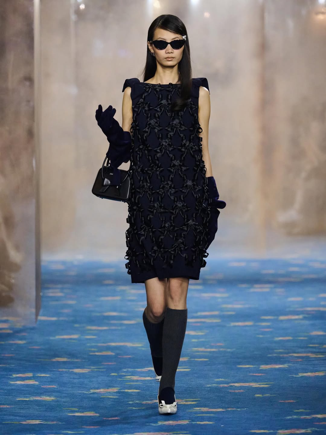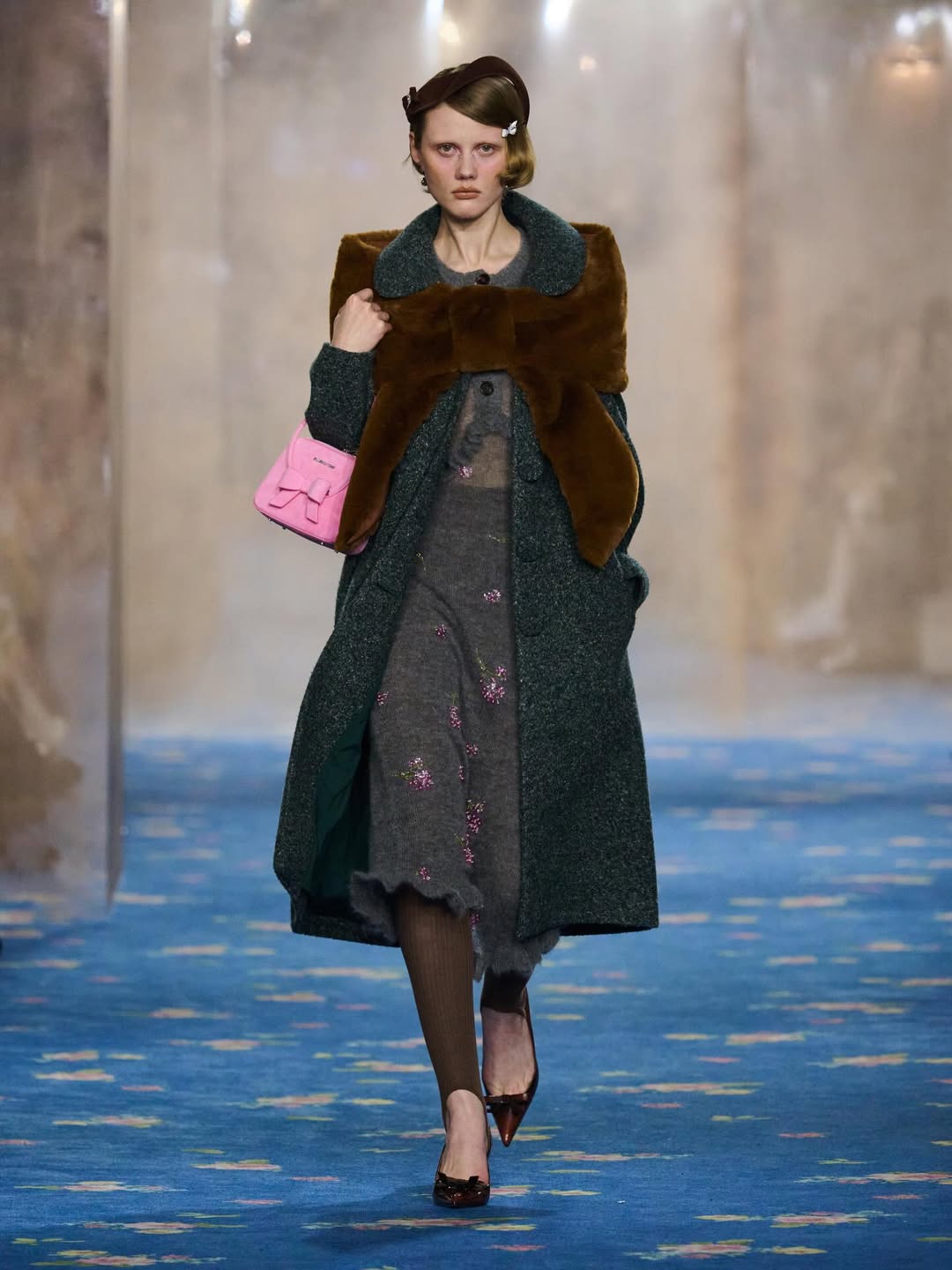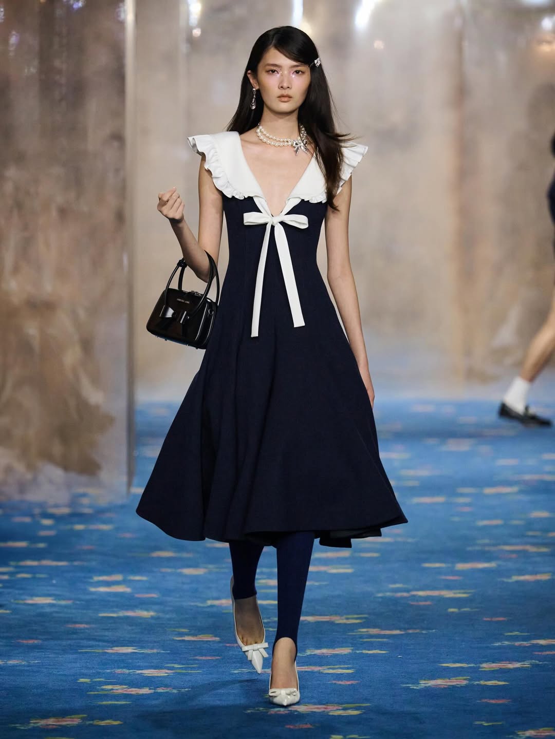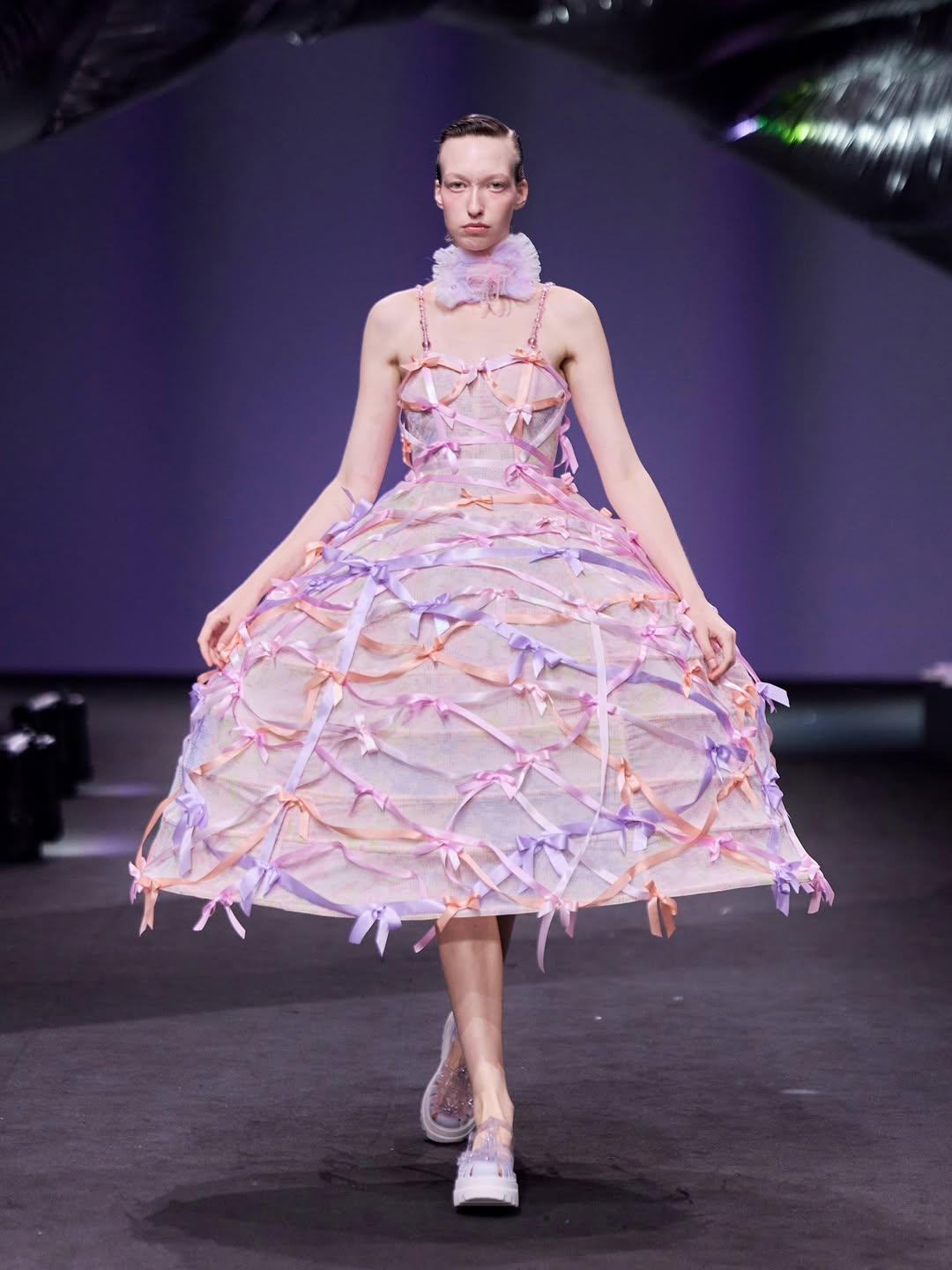 Claude Chabrol’s 1978 crime drama, Violette, starring Isabelle Hupert serves as the inspiration for this collection. The film tells the true story of teenager Violette Nozière, a wayward teen and occasional prostitute convicted of murder after poisoning her father. A common theme emerging at SHFW’s Autumn/Winter 2026 shows involves the tension between girlhood and womanhood. In this scenario, the push and pull is easy to decipher: girlish ribbons and floral embellishments find their way onto elegant 1930s silhouettes; faux fur stoles are wrapped into oversized bows; and modest A-line frocks are rebelliously re-envisioned as t-shirt dresses.