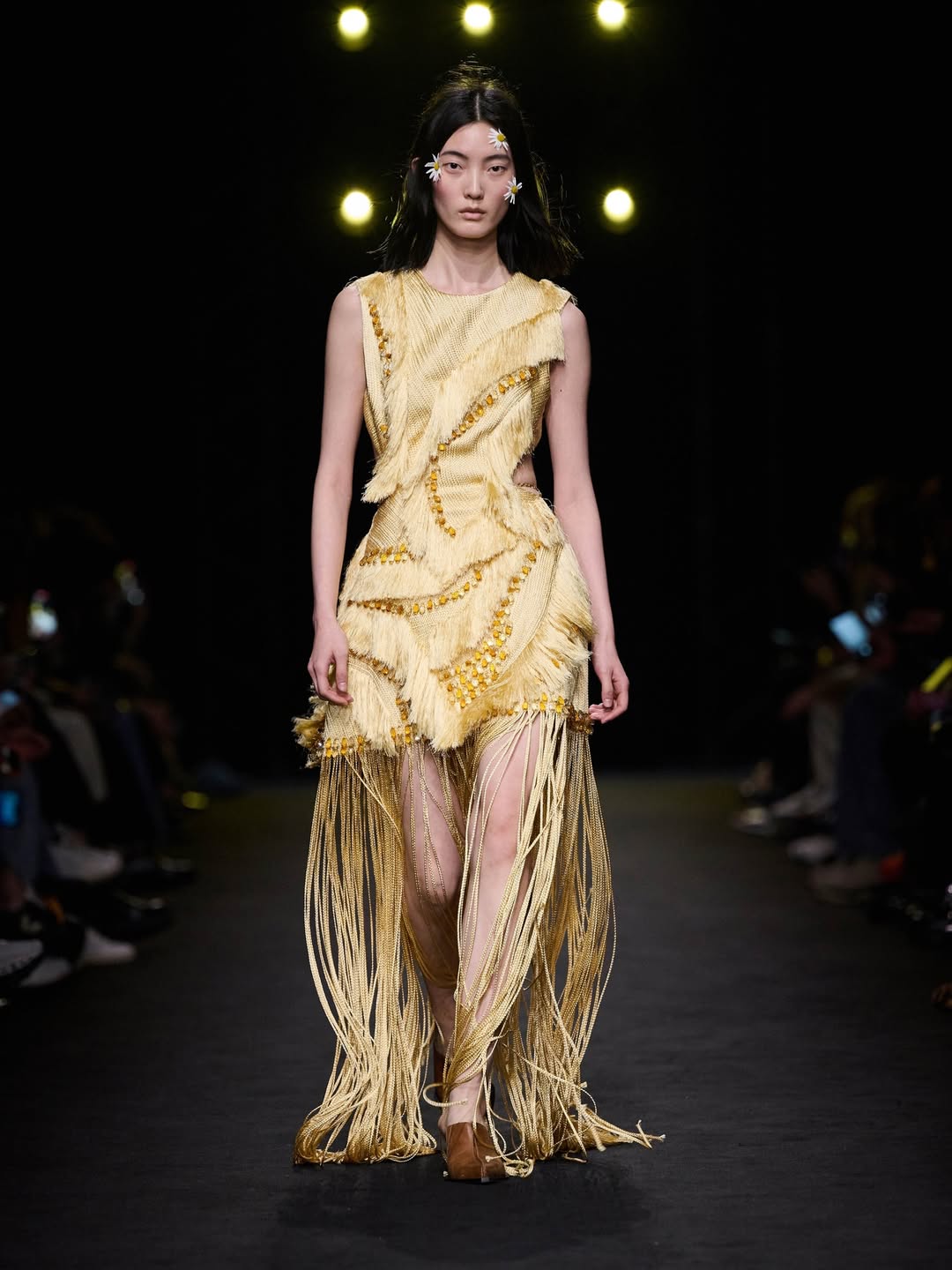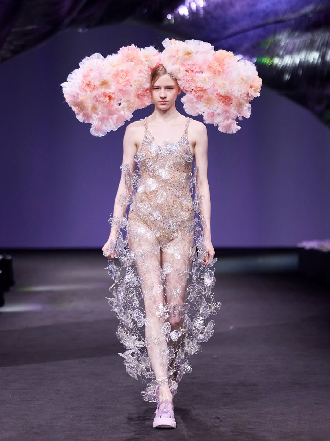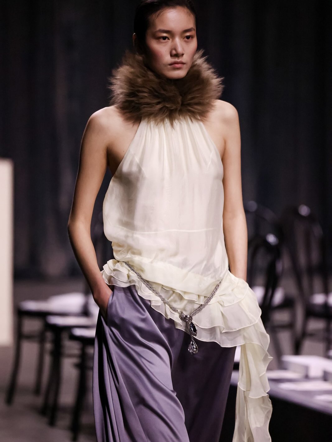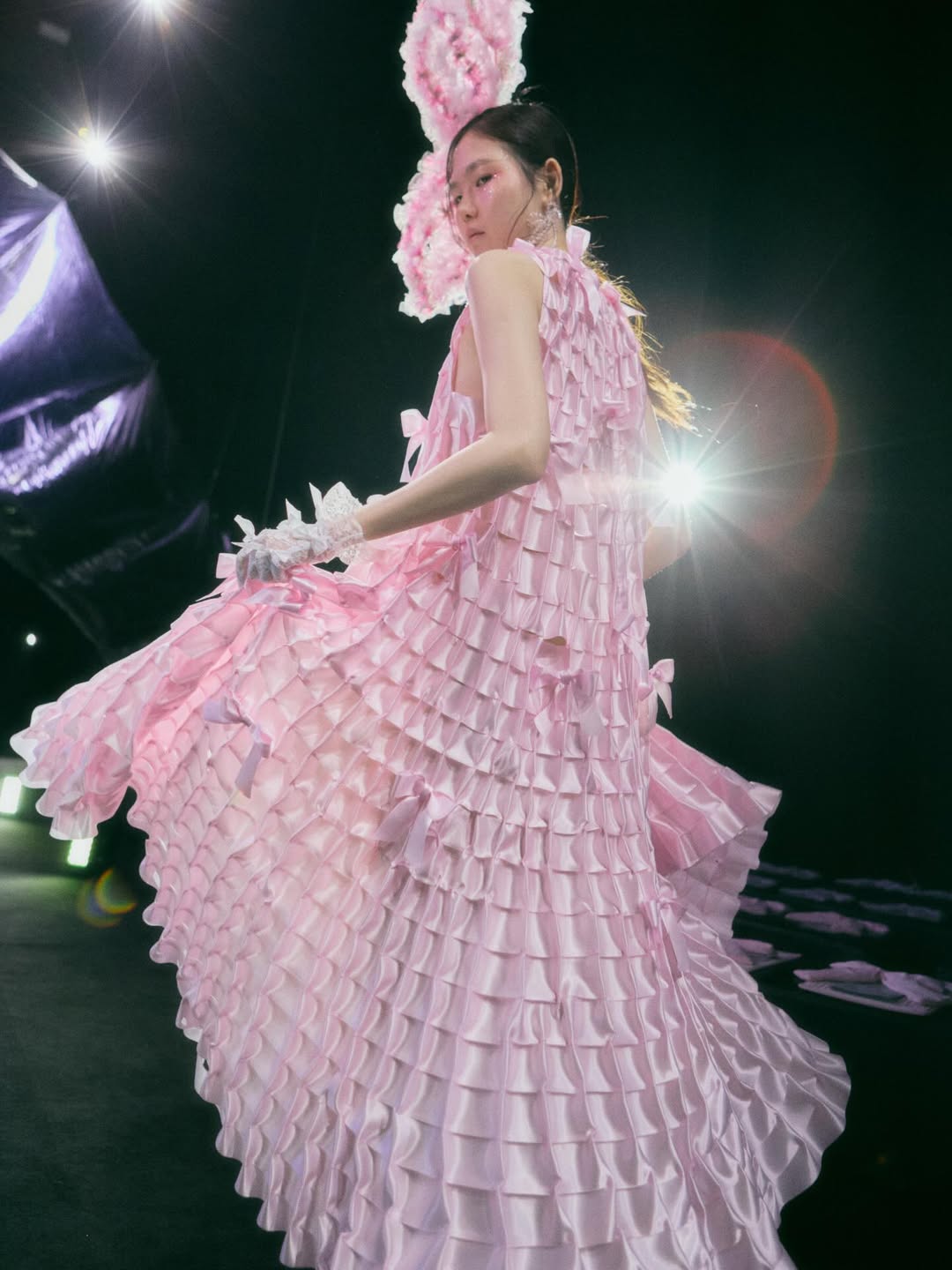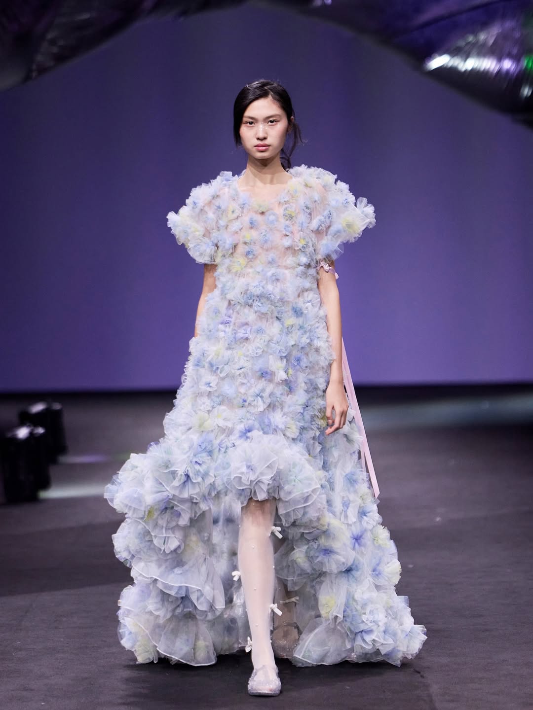 Susan Fang’s Autumn/Winter 2026 collection, Air-Flip, is weightless. Drawing inspiration for nature, her airy designs with cascading floral details are made possible through careful gathering, laser-cutting, and hand-knotting.
