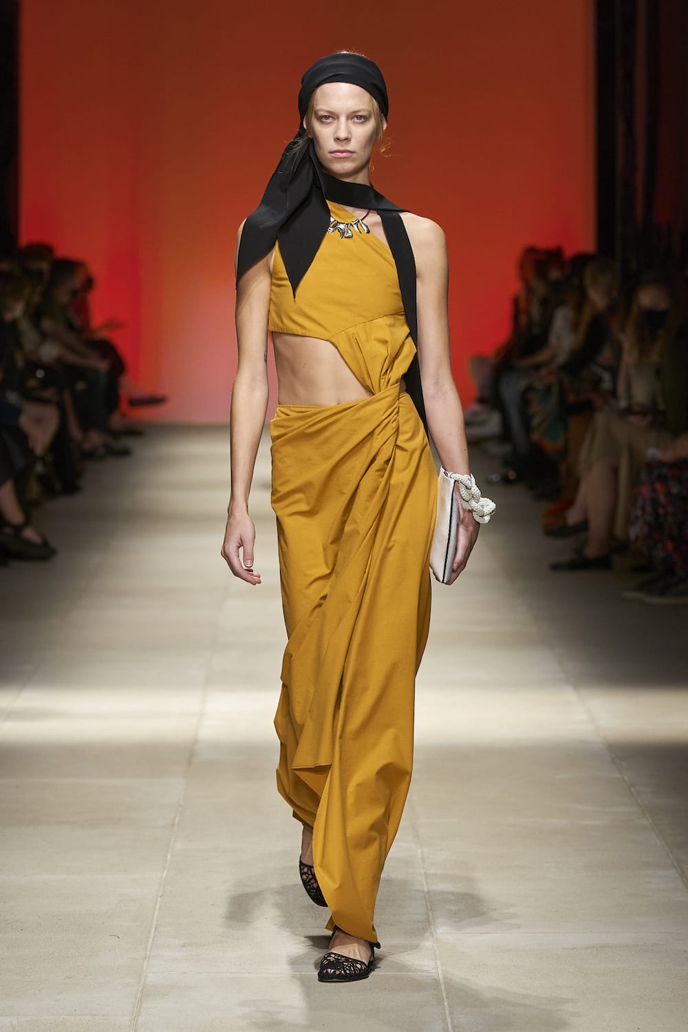 For Spring/Summer '22, Salvatore Ferragamo presented a collection imbued with a modern Bohemian flair. Titled "Tale of Summer", natural hues and saturated tones dominated the refined collection that offered comfortable and practical pieces for the everyday. Cue billowing dresses and tunics; smart high-waist trousers; and relaxed knits in soft palettes that were anything but muted and subdued. Fringe detail and cut-outs added movement and a hint of sexiness to the overall relaxed atmosphere of the clothes. The collection also implemented archival elements such as a 1970s Ferragamo floral motif by Parisian artist Julien Colombier. Watch out for Ferragamo's oversized Studio and Trifolio bags and Bohemian leather clogs.