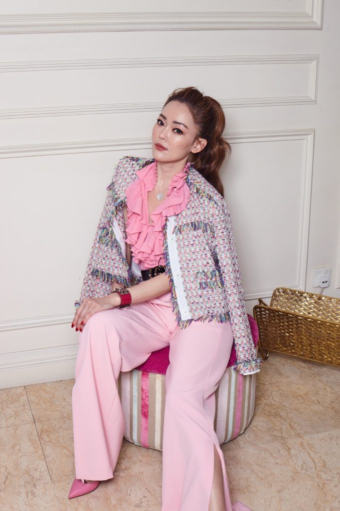 Another classic Chan signature aesthetic includes injecting a dose of hyperfeminity into the remix. For her second look, she opted for an all-pink look; dramatic ruffled pink top from C/Meo Collective and tailored high-waisted trousers from AQ/AQ paired with eclectic MSGM tweed jacket and a pair of chic Valentino pumps. In between shots, Chan spoke warmly about her favourite fashion designer, Olivier Rousteing, whom she admires. “I love what he (Olivier) has done for the brand. His bright, sexy and youthful designs appeals to people of all ages –something that is tough for most brands to achieve these days,” she explains.