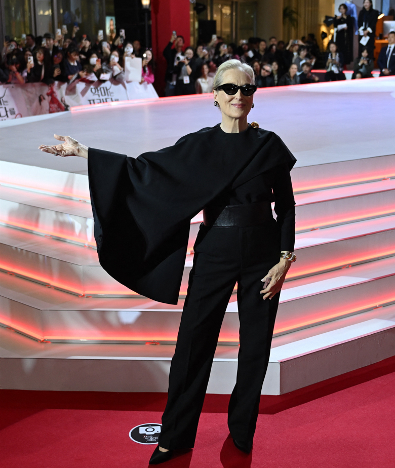 For the Seoul premiere, Meryl Streep donned a Celine draped top in silk and wool, and paired it with maxi tux trousers, a black leather belt and the Minnie pump. Anne Hathaway wore Look 64 from the Balenciaga Autumn/Winter 2026 collection—a high collar blouson dress in red smooth light leather with Duchesse pump in black calfskin. She completed the look with a High Jewellery Serpenti necklace and bracelet in pink gold 18kt with onyx elements and a 2 pear-shaped diamonds.