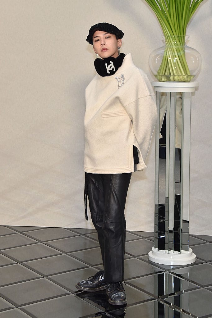 Last but not least, G-Dragon attended the couture show in a white wool sweater with a glittery brooch and black leather pants, paired with Chanel black sequinned beret and earmuffs.