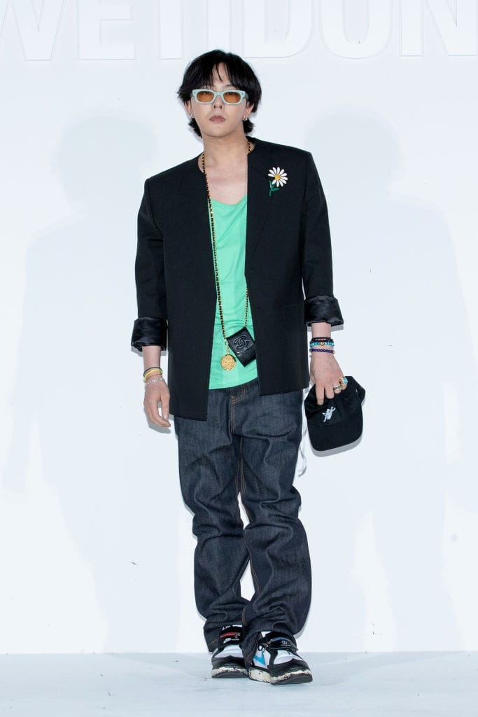 G-Dragon wore a blue Dior suit, a black scarf and a bag decorated with We11done’s pins and emblems, with his own brand Peaceminusone’s signature clip on the collar of the jacket.