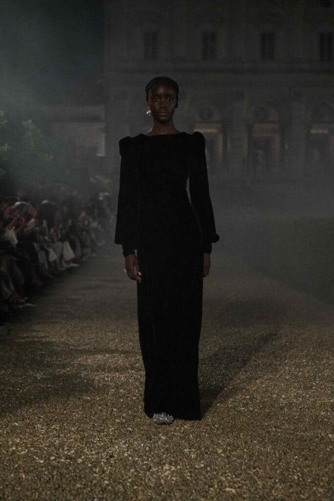 Touches of black and red velvet punctuate the otherwise white palette, nodding to the Fontana Sisters who famously dressed Anita Ekberg in La Dolce Vita. A golden velvet gown becomes the epitome of refinement.