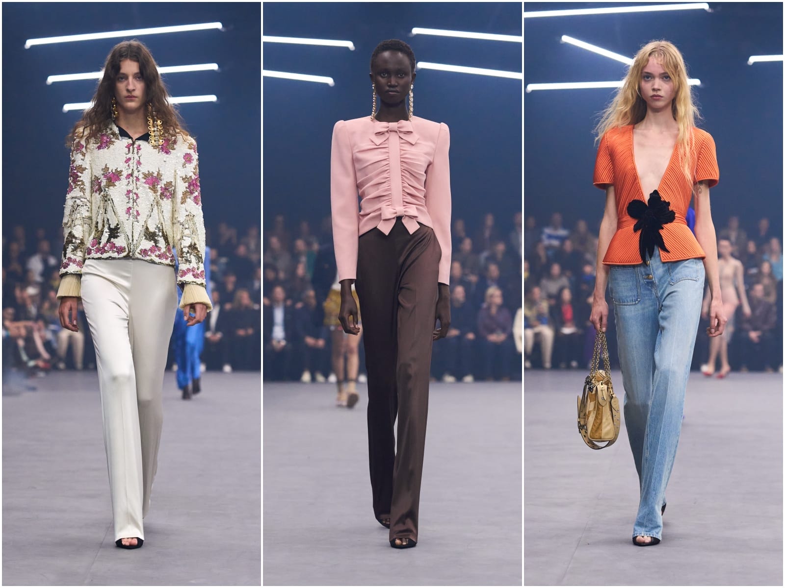 Additionally, florals, sequins and bows (an SS26 top trend) crop up elsewhere. Bow-ties adorn a flouncy baby doll and a tailored dress.