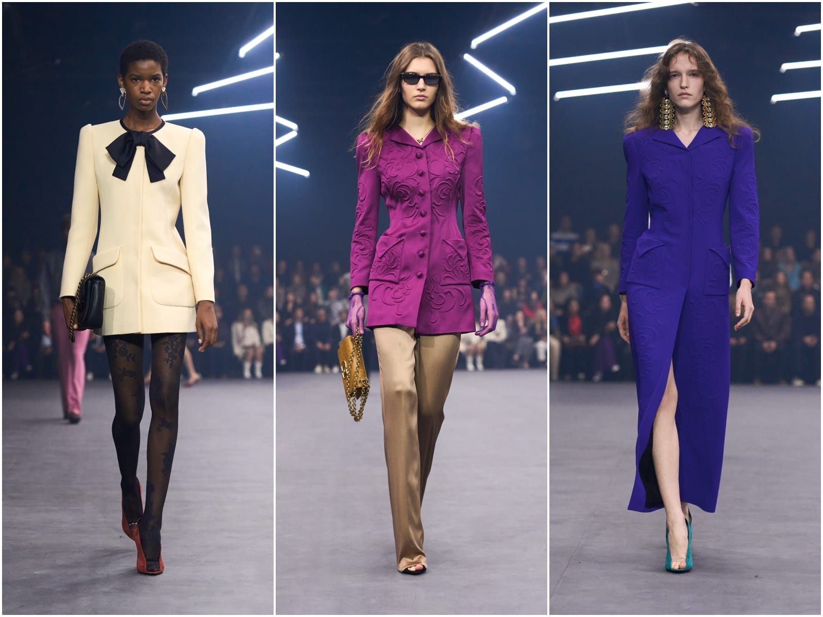 Usually a stoic ensemble—almost all the blouses are long-sleeved, some with corporate-adjacent Winchester cuffs and collar—Michele injected emotion into the combo. Observe rich chiffon, satin and gathered velvet, plus the occasional bows, florals and sequins.