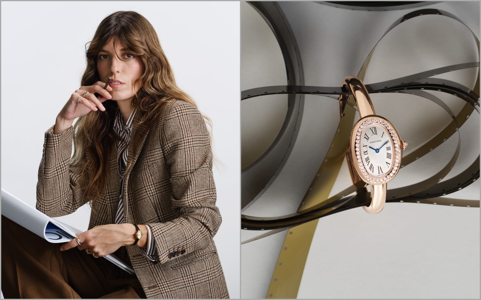 Right: the Baignoire bangle small model in rose gold with diamond bezel, Cartier