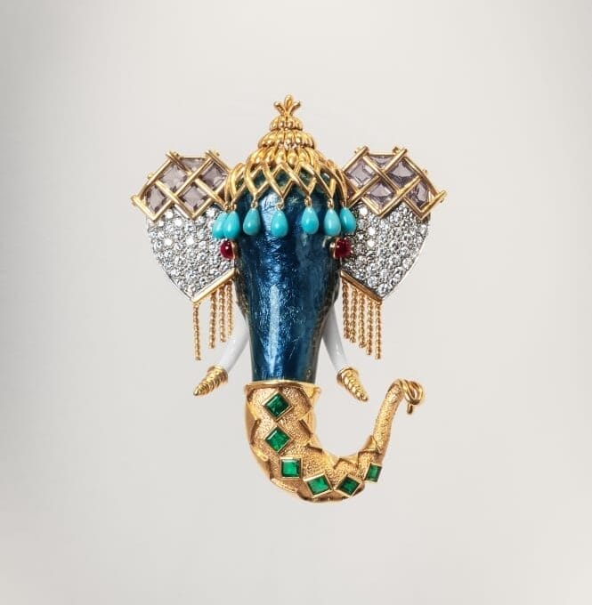 Elephant Head Clip, Jean Schlumberger for Tiffany & Co. (1968) Gold, platinum, diamonds, emeralds, turquoise, enamel Joan and Jack Quinn Collection
