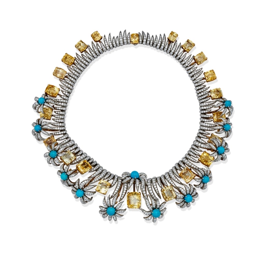 Hedges and Flowers Necklace, Jean Schlumberger for Tiffany & Co. (1960) Gold, platinum, diamonds, yellow sapphires, turquoise The Tiffany Archives