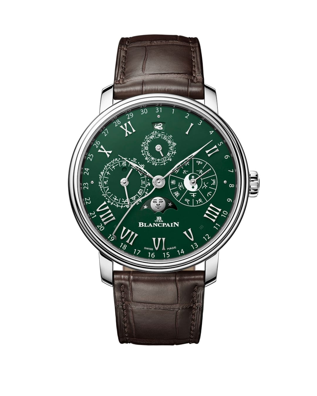 The watch is powered by the Calibre 3638 with a 7-day power reserve. In front, the dial houses a magnificent array of functions. A display of the five elements with Yin and Yang (linked to the sexagesimal cycle) sits at 3 o’clock. Then, the Chinese days and months are at 9 o’clock while double Chinese hours reside at 12 o’clock. Elsewhere, the moon phase is placed at 6 o’clock. Also, a serpentine hand guides us to the Gregorian date, and the strap is in a brown alligator leather.