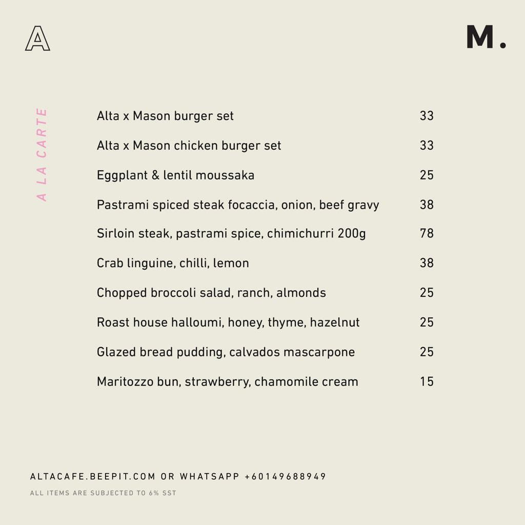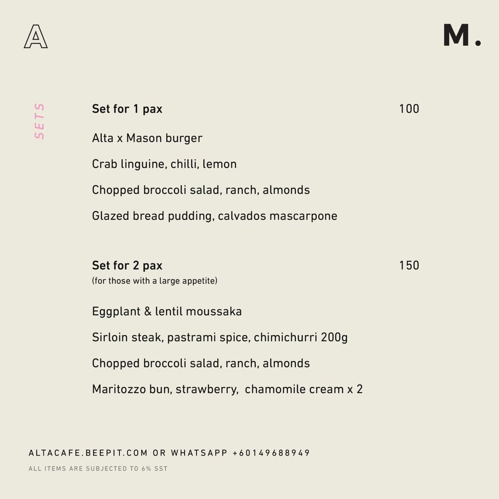 The limited-edition menu is available from the 27th-29th of August. You can select from their A’ la Carte or Set Menu. There are two set menus for 1 or 2 persons. Each menu is carefully curated to bring you an exclusive experience featuring signature dishes from Alta Cafe and Mason Restaurant.